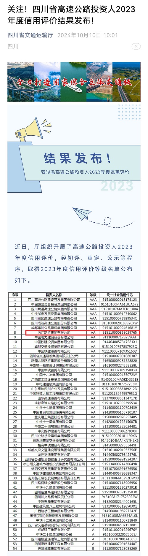 10月10日,四川省交通運(yùn)輸廳正式發(fā)布公告,內(nèi)江路橋集團(tuán)有限公司(以下簡稱“內(nèi)江路橋集團(tuán)”)成為內(nèi)江市唯一獲評(píng)四川省高速公路投資人2023年度信用評(píng)價(jià)等級(jí)AA級(jí)企業(yè)。這是繼2020年首次獲評(píng)該等級(jí)后,連續(xù)第四年蟬聯(lián)AA等級(jí)。